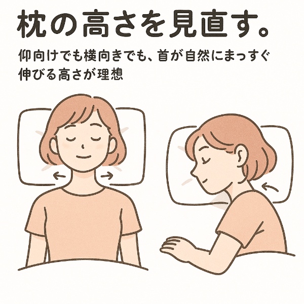仰向けでも横向きでも、首が自然にまっすぐ伸びる高さが理想です。