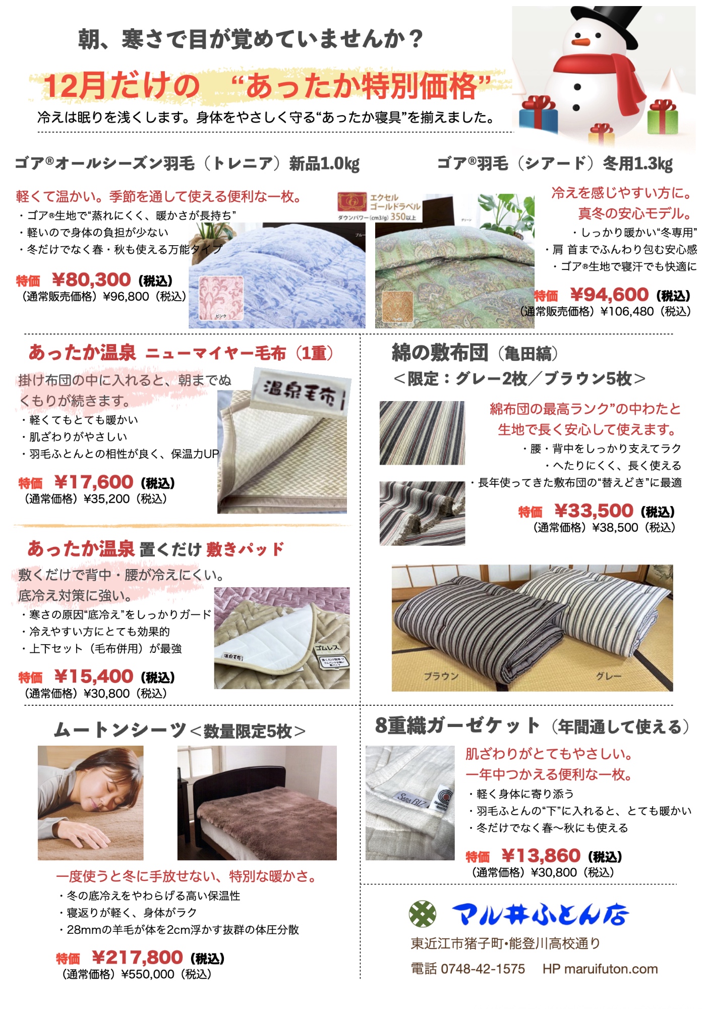 この歳末、マル井ふとん店では、今の寒さにしっかり対応できる寝具を中心に、12月だけの《あったか特別価格》で販売しています。