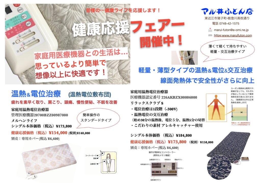 「健康応援フェア」として、温熱&電位治療を取り入れた家庭用医療機器をご案内しています。